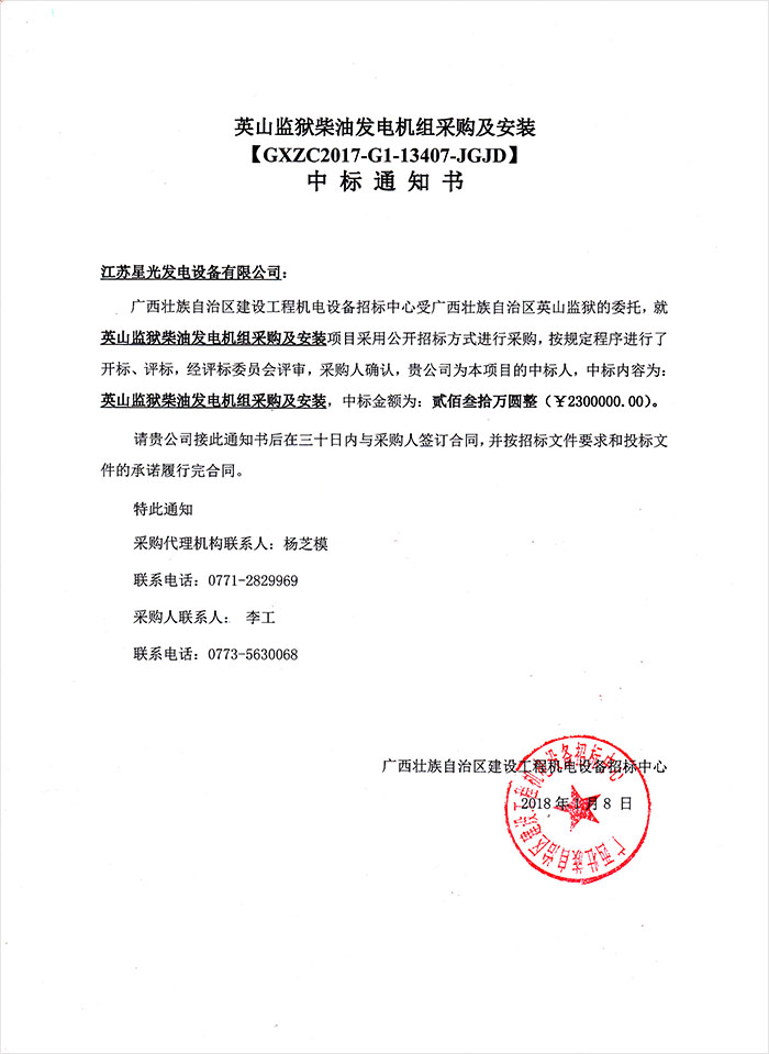 江蘇星光動(dòng)力集團(tuán) >> 新聞動(dòng)態(tài) >> 熱烈祝賀我公司順利中標(biāo)廣西壯族自治區(qū)英山監(jiān)獄2臺(tái)1000KW柴油發(fā)電機(jī)組