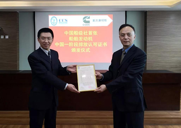 中國船級社頒發(fā)國內(nèi)首份船舶發(fā)動機中國第一階段排放認可證書