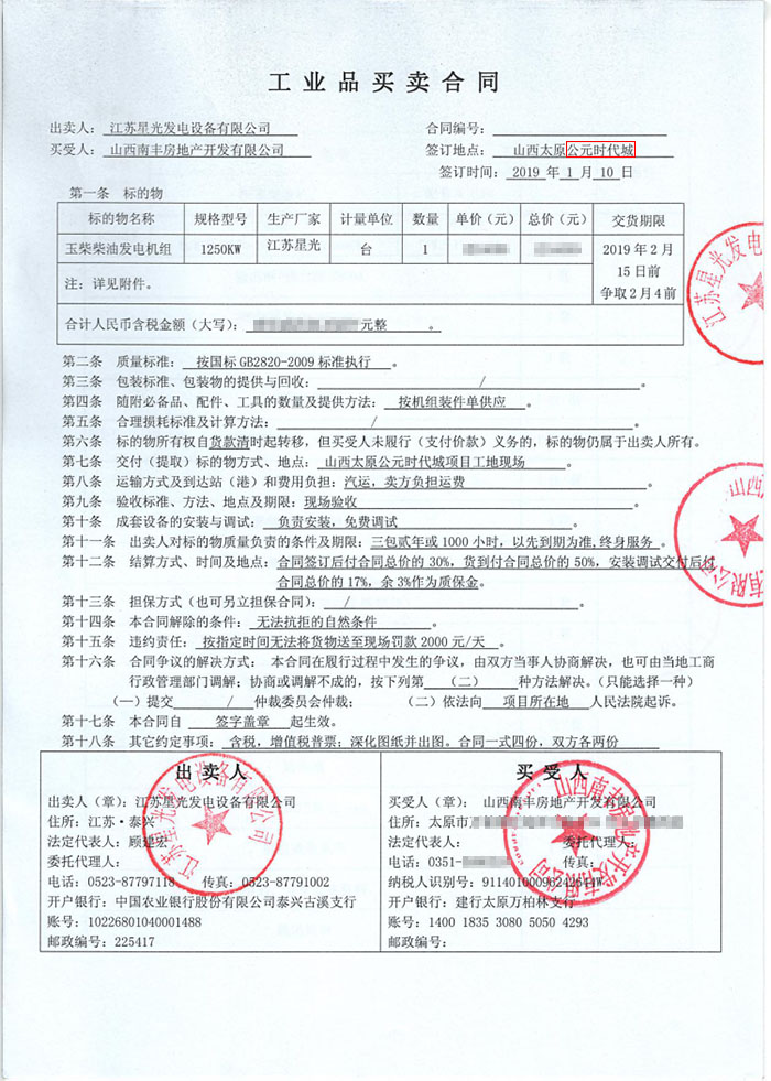 江蘇星光動力集團(tuán) >> 新聞動態(tài) >> 我公司成功簽訂山西南豐地產(chǎn)公司公元時代城項目1250KW玉柴發(fā)電機(jī)組一臺