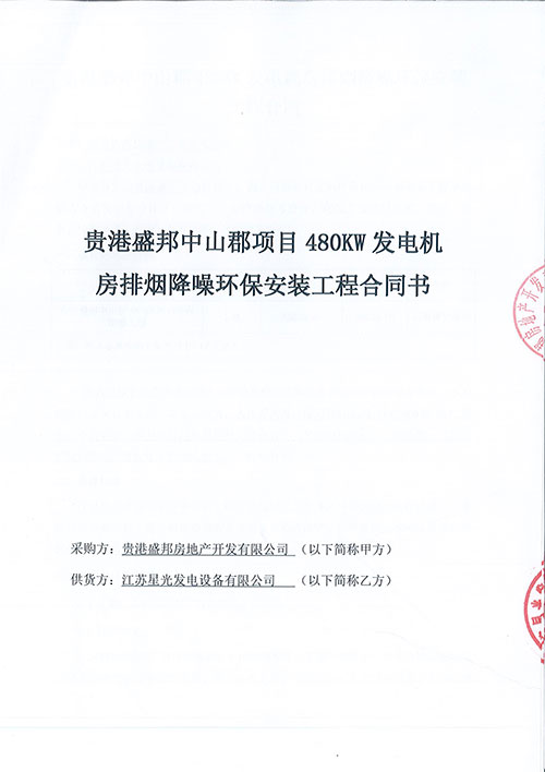 2020年3月31日,我司與盛邦中山郡簽訂了一臺(tái)480KW的上柴發(fā)電機(jī)組,型號(hào)SC27G755D2發(fā)動(dòng)機(jī)配江蘇星光,這次我們也會(huì)在合同規(guī)定時(shí)間內(nèi)完成機(jī)房降噪、排煙、環(huán)保工程,確保工程設(shè)計(jì)及施工質(zhì)量要求符合國(guó)家相關(guān)技術(shù)要求和施工驗(yàn)收標(biāo)準(zhǔn)、規(guī)范及規(guī)程。