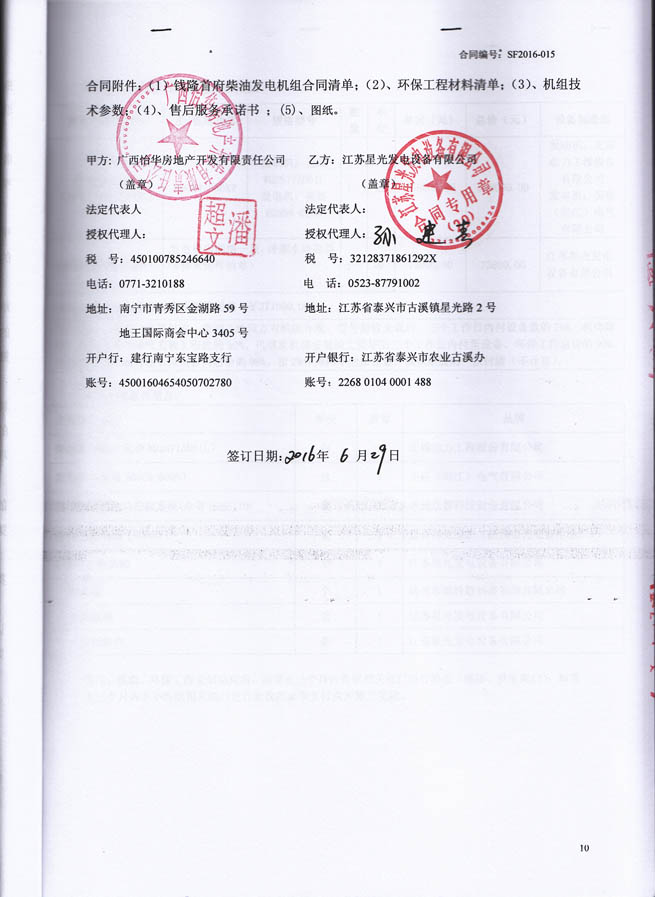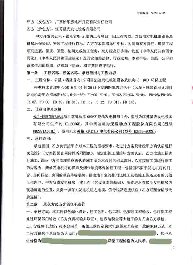 2016年6月29日,廣西怡華房地產(chǎn)開發(fā)有限責任公與我公司簽訂云星?錢隆首府A塊地(1號樓、2號樓、5號樓、6號樓)柴油發(fā)電機組設備及機房環(huán)保采購、安裝工程合同,我公司為其提供常用功率600KW柴油發(fā)電機組1臺,型號為我江蘇星光發(fā)電設備有限公司生產(chǎn)的XG-600GF,其中柴油機為無錫動力工程股份有限公司(型號WD287TAD61L),發(fā)電機為英格(陽江)電氣有限公司(型號EG355-600N)。