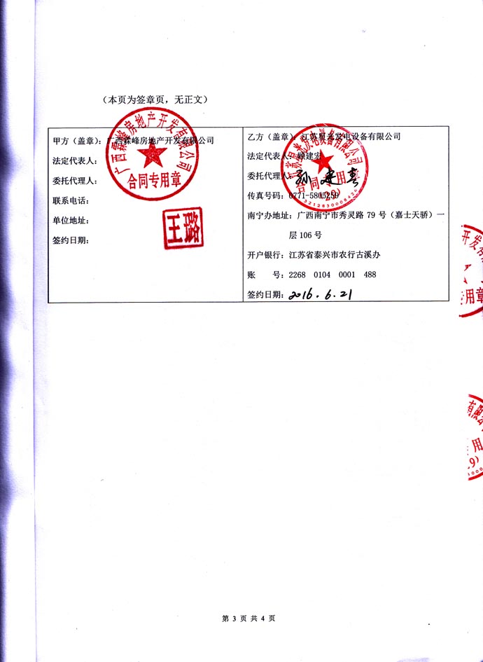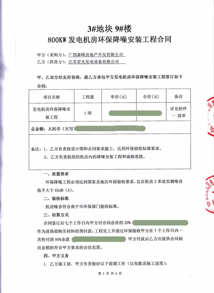 2016年6月21日 廣西霖峰房地產(chǎn)開發(fā)有限公司與我公司簽訂3#塊地9#樓 800KW發(fā)電機(jī)組 發(fā)電機(jī)房環(huán)保降噪安裝工程合同,我公司為其提供一臺里卡多柴油發(fā)電機(jī)組的發(fā)電機(jī)房環(huán)保降噪除塵安裝工程的工作,負(fù)載工程所需材料購買、安裝和油路連接,并保證工程達(dá)到環(huán)保驗(yàn)收標(biāo)準(zhǔn)要求。合同如下: