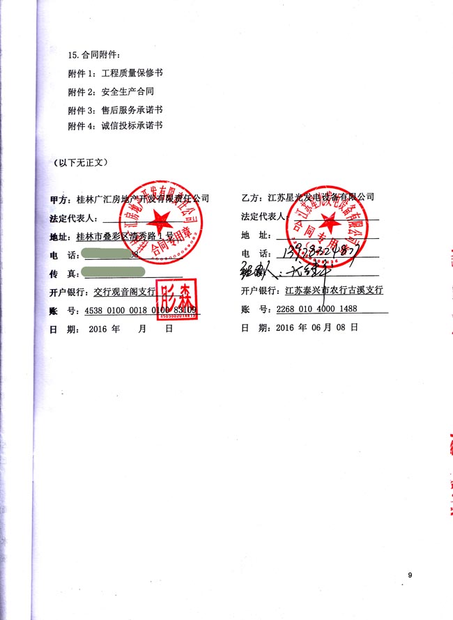 2016年6月8日,桂林廣匯房地產(chǎn)開發(fā)有限責(zé)任公司與我公司簽訂清華園一期發(fā)電機(jī)采購(gòu)及安裝工程合同,我公司為其提供一臺(tái)常用功率450KW柴油發(fā)電機(jī)組和機(jī)組配備的電瓶、油箱、輸油管、排煙管等設(shè)備,以及機(jī)組的運(yùn)輸安裝調(diào)試工作。機(jī)組配置選用的品牌為重慶康明斯柴油機(jī);上??破?/span>發(fā)電機(jī);鄭州眾智控制器。發(fā)電機(jī)產(chǎn)品購(gòu)銷合同如下: