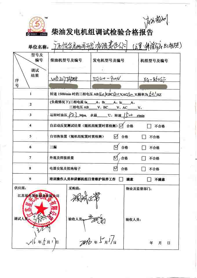 2016年5月17日,云星錢隆首府B1地塊的柴油發(fā)電機(jī)安裝現(xiàn)場(chǎng),我公司發(fā)電機(jī)技術(shù)人員對(duì)為廣西怡華房地產(chǎn)開發(fā)有限責(zé)任公司提供的850KW發(fā)電機(jī)組進(jìn)行最后的調(diào)試驗(yàn)收和消防檢測(cè)工作,并培訓(xùn)操作人員和講解機(jī)組日常維護(hù)保養(yǎng)工作。以下是發(fā)電機(jī)組調(diào)試驗(yàn)收單: