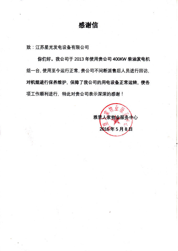 2016年5月8日,我江蘇星光動(dòng)力集團(tuán)售后人員收到雅里人家物業(yè)服務(wù)中心的感謝信,對(duì)我公司提供的400KW柴油發(fā)電機(jī)組及售后服務(wù)反應(yīng)迅速,上門維修保養(yǎng)服務(wù)到位,認(rèn)真的售后服務(wù)工作表示感謝!