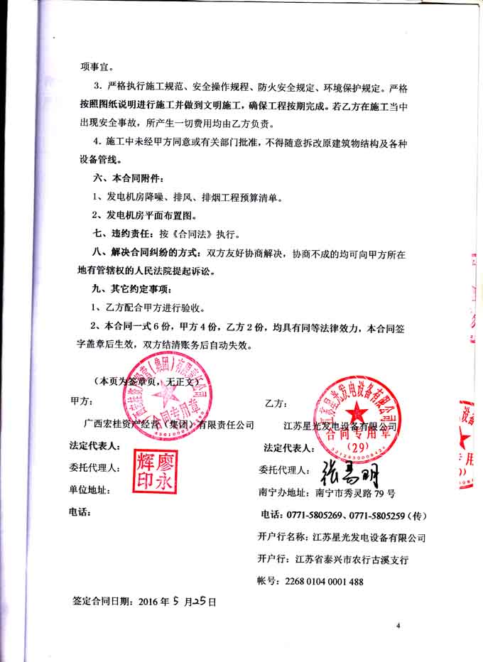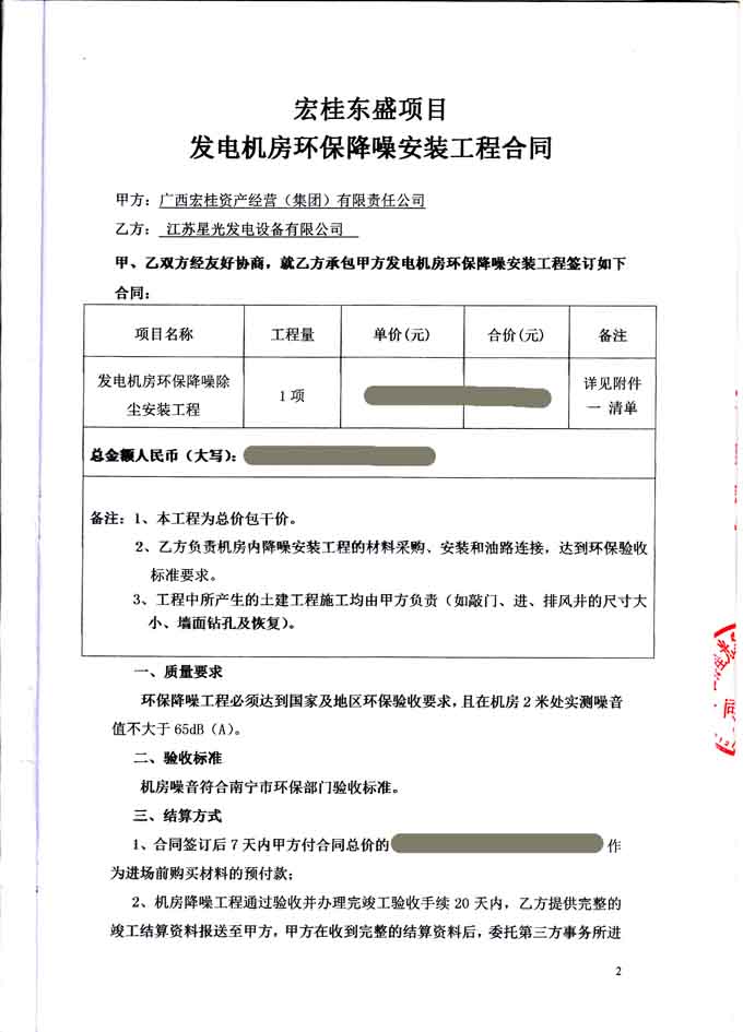 2016年5月25日 廣西宏桂資產(chǎn)經(jīng)營(集團(tuán))有限責(zé)任公司工程與我公司簽訂宏桂東盛項(xiàng)目發(fā)電機(jī)房環(huán)保降噪安裝工程合同,我公司為其提供一臺640KW里卡多柴油發(fā)電機(jī)組的發(fā)電機(jī)房環(huán)保降噪除塵安裝工程的工作,負(fù)載工程所需材料購買、安裝和油路連接,并保證工程達(dá)到環(huán)保驗(yàn)收標(biāo)準(zhǔn)要求。合同如下: