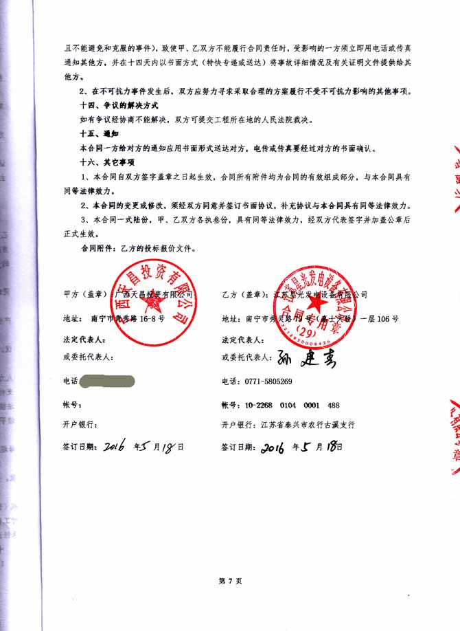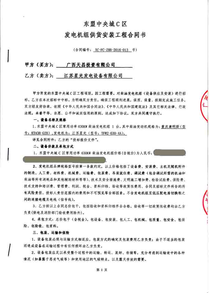 2016年5月18日,我公司憑借精湛的發(fā)電機(jī)技術(shù),優(yōu)良的品質(zhì)和完善的售后服成功與廣西天昌投資有限公司簽訂?wèn)|盟中央城C區(qū)發(fā)電機(jī)組供貨安裝工程合同,我公司為其提供 常用功率630KW柴油發(fā)電機(jī)組一臺(tái),其中柴油發(fā)動(dòng)機(jī)規(guī)格為:重慶康明斯(型號(hào):KTA38-G2B),發(fā)電機(jī)為:江蘇星光(型號(hào)TFW2-630-4A)。發(fā)電機(jī)產(chǎn)品購(gòu)銷合同如下: