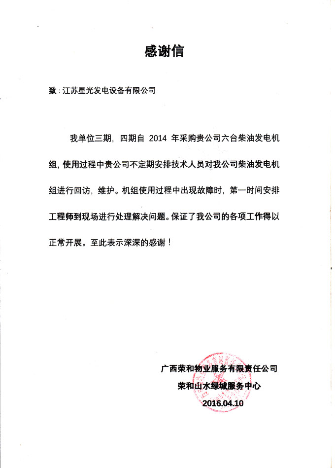 2016年4月10日,收到廣西榮和物業(yè)服務(wù)有限責(zé)任公司致我公司感謝信,其對(duì)我公司售后服務(wù)技術(shù)人員服務(wù)反應(yīng)迅速,上門維修保養(yǎng)柴油發(fā)電機(jī)服務(wù)到位,認(rèn)真的售后服務(wù)工作表示感謝!