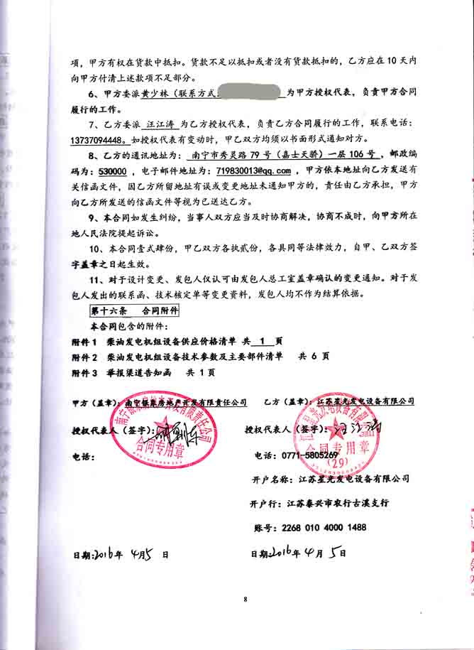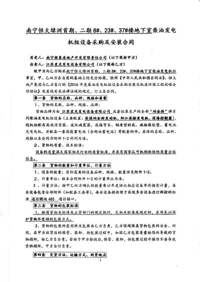 2016年4月5日,南寧銀象房地產開發(fā)有限責任公司與我公司簽訂南寧恒大綠洲首期、二期8#、23#、37#樓地下室柴油發(fā)電機組設備采購及安裝合同,我公司為其提供配置為英國珀金斯發(fā)動機、陽江英格發(fā)電機深海控制器的400KW發(fā)電機組、640KW發(fā)電機組、800KW發(fā)電機組各一臺,機組配有高效消音器、波紋減震器及蓄電池等附件。發(fā)電機產品購銷合同如下: