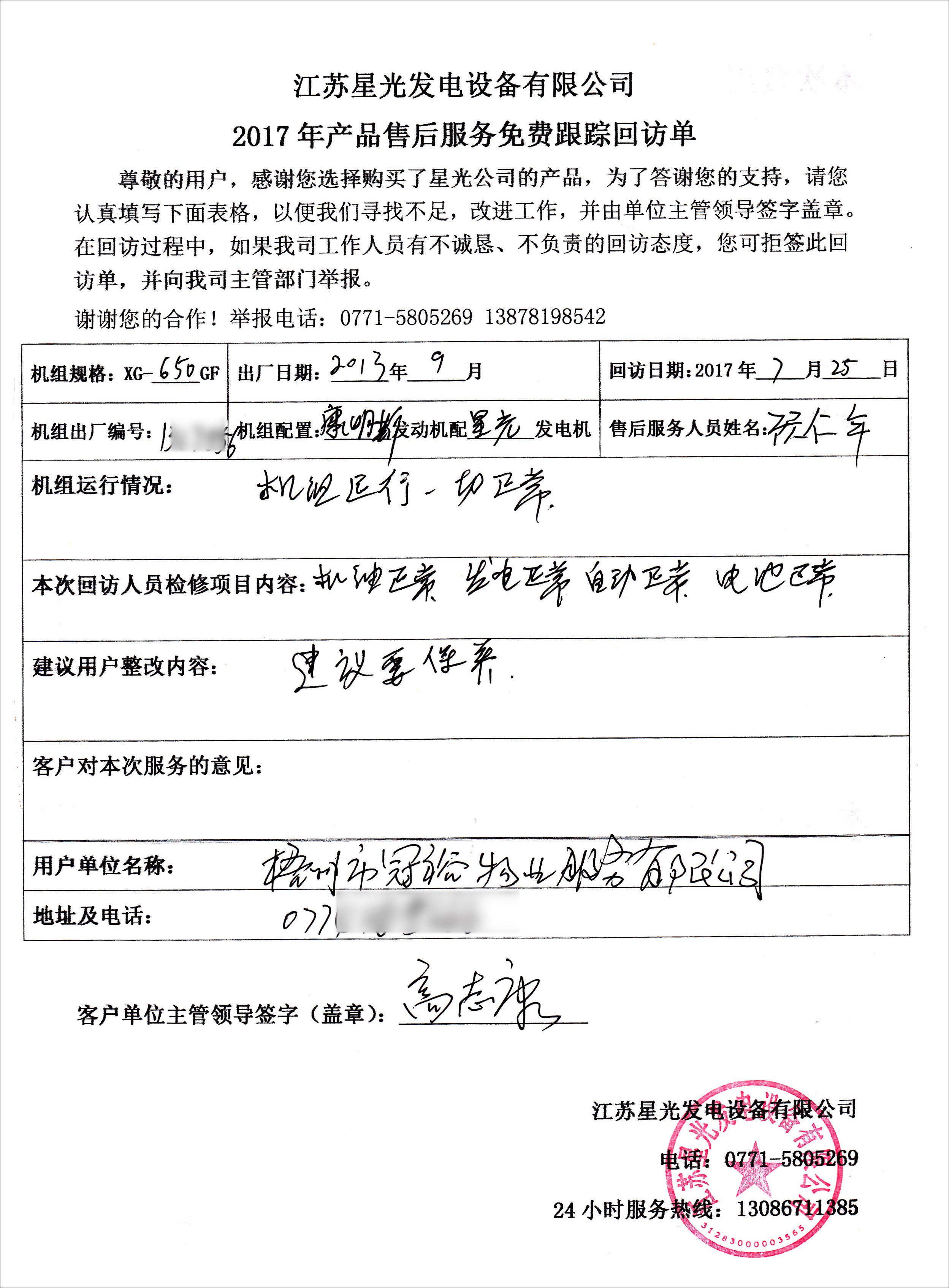 7月25日,我公司售后技術(shù)員顧師傅到梧州冠裕物業(yè)公司對(duì)其于2013年9月在我司購(gòu)買(mǎi)的兩臺(tái)康明斯發(fā)電機(jī)組進(jìn)行免費(fèi)售后回訪(fǎng)服務(wù)。顧師傅檢查了機(jī)油、電池及機(jī)組自動(dòng)化、發(fā)電情況均正常。因機(jī)組已使用較長(zhǎng)時(shí)間,顧師傅建議對(duì)機(jī)組進(jìn)行保養(yǎng),以確保機(jī)組正常運(yùn)行。更多關(guān)于康明斯發(fā)電機(jī)組售后服務(wù)歡迎撥打星光熱線(xiàn):13878198542