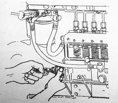 第一種方法:拆下第一缸的高壓油管,轉(zhuǎn)動曲軸,使第1缸活塞處于膨脹沖程始點,此時飛輪殼上的指針對準(zhǔn)飛輪上的“0”度線。然后反轉(zhuǎn)柴油發(fā)電機組曲軸,使檢視窗上的指針對準(zhǔn)飛輪上相當(dāng)于噴濺提前角規(guī)定的角度,然后松開噴油泵傳動軸接合盤上的兩個固緊螺釘,按噴油泵的轉(zhuǎn)動方向,緩慢而均勻地轉(zhuǎn)動噴油泵凸輪軸至第1缸出油口油面剛剛發(fā)生波動的瞬時為止,如下圖所示,并擰緊接合盤上的兩個螺釘。