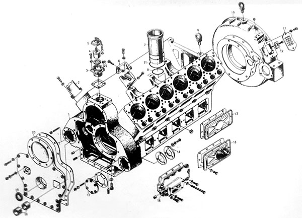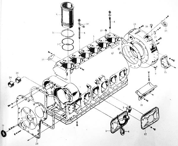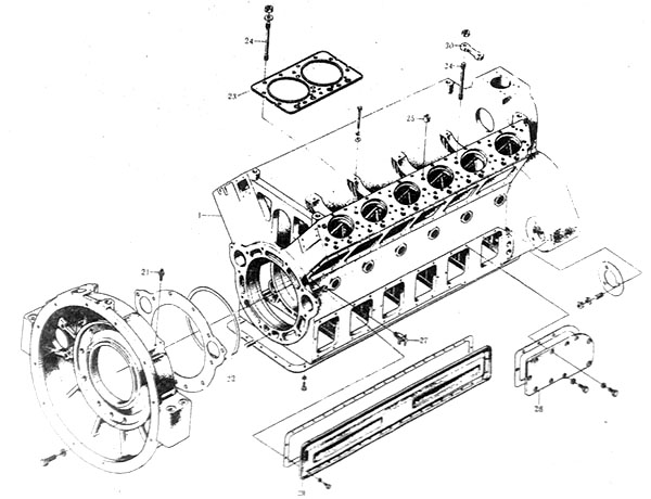 1-機(jī)體;2-側(cè)支架;3-上通氣管;4-濾芯部件;5-通氣管蓋;6-燃油濾清器支架;7-氣缸套;8-封水圈;9-吊環(huán)螺釘;10-飛輪殼;11-指針蓋板;12-指針;13、14、15、17-蓋板;16-側(cè)通氣管;18-凸輪軸軸承;19-骨架式橡膠油封;20-前蓋板;21-油管直接頭;22-鎖簧;23-氣缸蓋襯墊;24-氣缸蓋螺栓;25-定位套筒;26-蓋板;27-放水閥;28-上側(cè)蓋板;29-搭扣;30-氣缸蓋橋式墊塊;31-銅墊圈