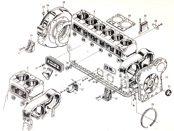 柴油發(fā)電機(jī)組機(jī)體由高強(qiáng)度鑄鐵制成,為隧道式結(jié)構(gòu)。4、6缸直列型柴油發(fā)電機(jī)組機(jī)體,除缸數(shù)不同外,結(jié)構(gòu)相似;12缸V型柴油發(fā)電機(jī)組機(jī)體兩列氣缸中心線夾角為75度,錯(cuò)缸距為45mm。機(jī)體結(jié)合組零部件如圖1、圖2、圖3所示。