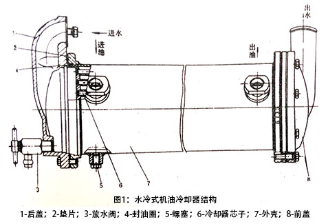 水冷式機油冷卻器為圓筒形,內部有黃鋼管、散熱片和隔片組成的芯子。水在芯子的管內流動;油在芯子與外殼的夾層流動,其基本結構如圖1所示。