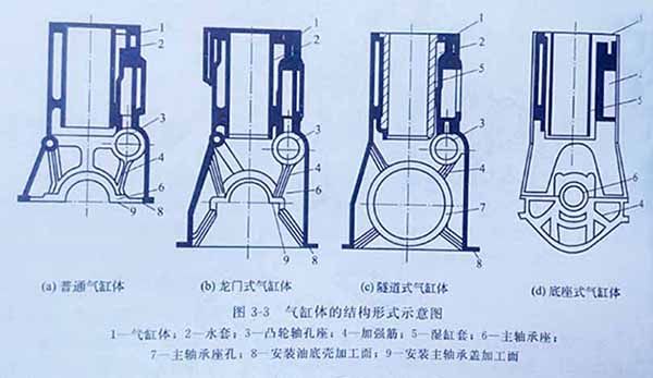 4、底座式(圖3-3(d))這種缸體的上曲軸箱內(nèi)無主軸承,曲軸在下曲軸箱上安裝,并承受主要負(fù)荷,底座式氣缸體適用于大型柴油機。