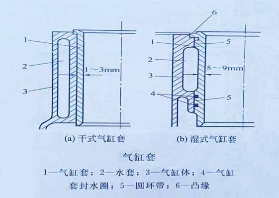 干式氣缸套(圖a)是壁厚為1~3毫米的薄壁圓筒,其特點是缸套的外表面不與冷卻水直接接觸。采用干式缸套的優(yōu)點是機體剛度較好,不存在冷卻水密封問題,缺點是缸套的散熱條件不如濕式缸套好,加工面增加,成本高,拆卸困難。