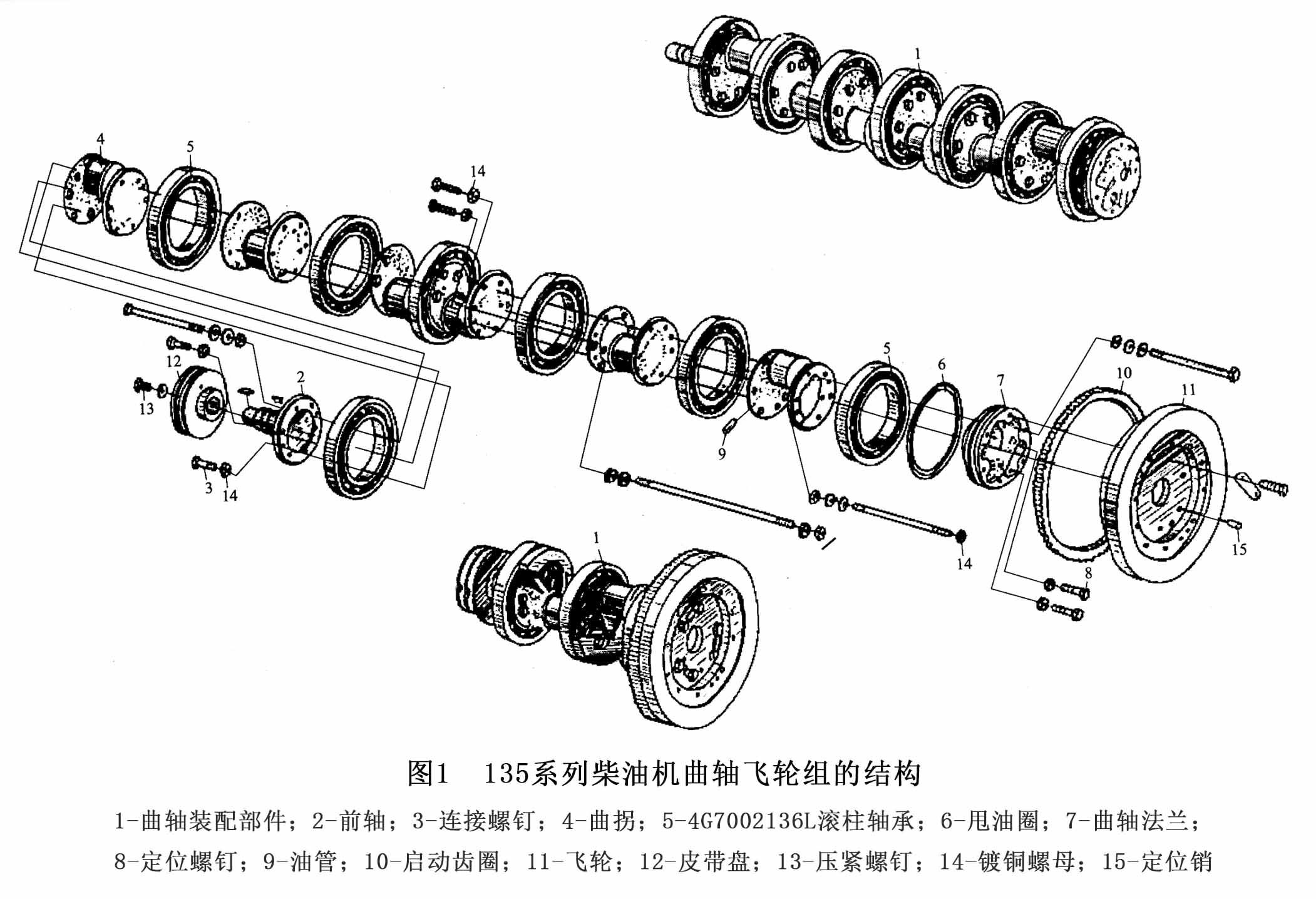 柴油發(fā)電機(jī)組曲軸飛輪組的功用是將活塞連桿組傳來的力轉(zhuǎn)變成扭矩,從軸上輸出機(jī)械功,同時(shí)驅(qū)動(dòng)柴油機(jī)各機(jī)構(gòu)及輔助系統(tǒng),克服非做功沖程的阻力,還可儲(chǔ)存和釋放能量,使柴油機(jī)運(yùn)轉(zhuǎn)平衡。它主要由曲軸、飛輪及扭轉(zhuǎn)減振器等組成。圖1為135系列柴油機(jī)曲軸飛輪組結(jié)構(gòu)圖。