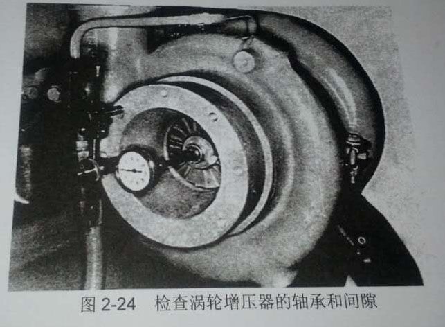 檢查軸承間隙。檢查時(shí)不需要將增壓器從發(fā)動(dòng)機(jī)上拆下,使用一個(gè)千分表測量轉(zhuǎn)子軸和端隙,用厚薄規(guī)測量徑向間隙,如圖2-24所示。