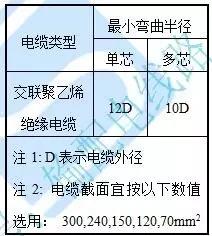 2)電纜路徑的上下左右轉向部位,均應滿足電纜允許彎曲半徑要求。如下表所示。