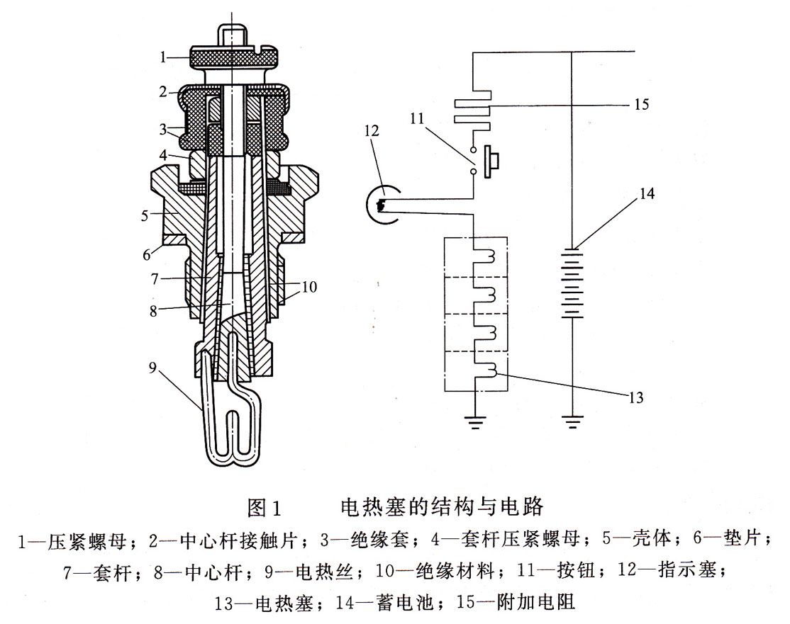 一般在采用渦流式或預(yù)燃式燃燒室的柴油機(jī)中裝有電熱塞,以便在啟動(dòng)時(shí)對(duì)燃燒室內(nèi)的空氣進(jìn)行預(yù)熱。螺旋形的電阻絲一端焊于中心螺桿上,另一端焊在耐高溫不銹鋼制造的發(fā)熱缸套底部,在鋼套內(nèi)裝有具有一定絕緣性能、導(dǎo)熱好和耐高溫的氧化鋁填充劑。各電熱塞中心螺桿用導(dǎo)線并聯(lián),并連接蓄電池上。在柴油機(jī)啟動(dòng)以前,先用專用的開(kāi)關(guān)接通電熱塞電路,很快發(fā)熱的鋼套使氣缸內(nèi)的空氣溫度升高,從而提高了壓縮終了時(shí)的空氣溫度,使噴入氣缸內(nèi)的柴油著火容易。