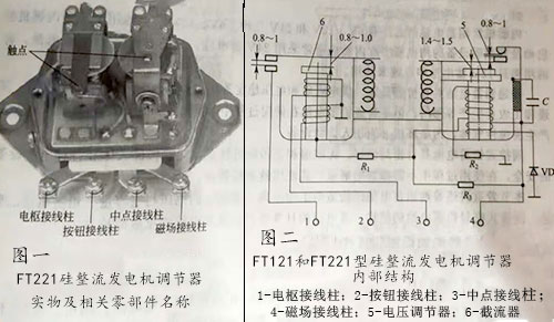 ③檢查各觸點(diǎn)間隙和氣隙(FT221型硅整流發(fā)電機(jī)調(diào)節(jié)器實(shí)物圖和相關(guān)觸點(diǎn)的間隙如圖一和圖二所示),若不符合要求,應(yīng)進(jìn)行調(diào)整。