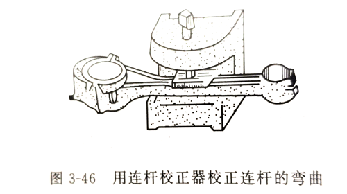 連桿彎曲度的校正,一般是利用連桿校正器上的附屬工具進行,如圖3-46所示,根據連桿彎曲的方向,把校正的專用工具夾在虎鉗上,對連桿進行壓正。注意;要邊壓邊檢查,直至連桿校正為止。