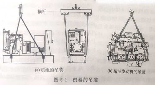 (1)機(jī)組的搬運(yùn)與存放 機(jī)組及其他電氣設(shè)備一般都有包裝箱,在搬運(yùn)時(shí)應(yīng)注意將起吊的鋼索結(jié)扎在機(jī)器的適當(dāng)部位,輕吊輕放。為了安裝而吊起機(jī)組時(shí),首先連接好底架上突出的升吊點(diǎn),然后檢查是否已牢牢掛住,焊接處有無裂縫,螺釘是否收緊,等等。另外,最好用橫桿起吊,以防機(jī)器碰傷[如圖5-1(a)所示,吊裝的點(diǎn)應(yīng)在重力的中心(靠近發(fā)動(dòng)機(jī))而不是整機(jī)的中心,這樣才可以垂直吊起,一旦機(jī)器離地,就要用導(dǎo)索來防止銷絲細(xì)扭結(jié)或機(jī)器搖擺。機(jī)器放下時(shí)要放置在平坦及能承載發(fā)電機(jī)重量的地方。如果吊起發(fā)電機(jī),應(yīng)安裝一個(gè)單點(diǎn)的懸吊裝置,標(biāo)準(zhǔn)有天蓋的機(jī)器已有單點(diǎn)懸吊裝置。柴油機(jī)的吊裝方法如圖5-1(b)所示。