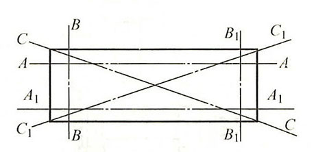 檢驗(yàn)殼(蓋)結(jié)合面的平面度,可按如下圖所示的方法測(cè)量。即將長(zhǎng)于被測(cè)件平面的直尺邊緣,逐一沿測(cè)量線AA、A1A1、BB、B1B1、CC、C1C1放置,并且用厚薄規(guī)測(cè)量直尺邊緣與被測(cè)件平面之間的間隙,以確定被測(cè)件結(jié)合面的平面度。也可將兩個(gè)互相結(jié)合的零件(如氣缸體與氣缸蓋)扣合在一起,用厚薄規(guī)測(cè)量其間的間隙,以確定被測(cè)件結(jié)合平面的平面度。