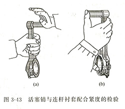 對(duì)柴油發(fā)電機(jī)組的柴油機(jī)而言,一般的檢驗(yàn)方法是:將活塞銷涂以機(jī)油,能用手掌的力量把活塞銷推入連桿襯套,并且沒有間隙的感覺,則認(rèn)為松緊度為合適【圖3-43(a)】對(duì)汽油機(jī)而言,一般的檢驗(yàn)方法是:將活塞銷涂以機(jī)油,能用大拇指的力量把活塞銷推入連桿襯套,并且沒有間隙的感覺,則認(rèn)為松緊度為合適【圖3-43(b)】;接觸面積在75%以上,并且接觸點(diǎn)分布均勻,輕重一致,則認(rèn)為接觸面符合要求。