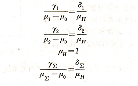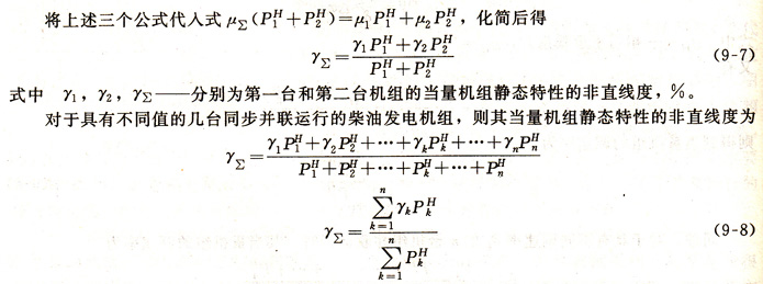 兩臺并聯(lián)運行的柴油發(fā)電機的靜態(tài)調(diào)速假定相等,不靈敏度也相等并為零。即δ1=δ2,ε1=ε2 =0。非直線度及標(biāo)定功率分別為γ1、γ2托和pH 1、pH 2,則當(dāng)量機組的靜態(tài)調(diào)速特性的非直線度γ計算如下。