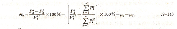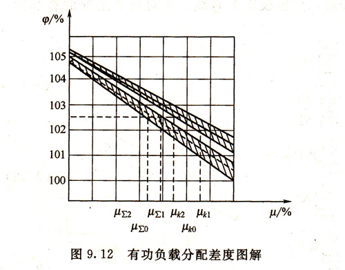 當(dāng)量機(jī)組和第k臺(tái)機(jī)組的調(diào)速特性見圖9. 12。其有功負(fù)載的分配差度Θ又可寫成如下形式