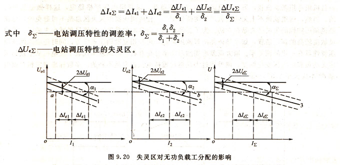 從圖9. 20的調(diào)壓特性可以看出,當(dāng)電站的無功負(fù)載為IΣ時(shí),電站的電壓可能是△UεΣ間的任意值,另一方面,對任何一個電站電壓U,來說,每臺發(fā)電機(jī)的無功電流,也可能是I1±△Iε1I2△Iε2范圍內(nèi)的任意值,其中,就是失靈區(qū)可能引起的最大電流偏差。在極限情況下,一臺發(fā)電機(jī)工作在調(diào)壓特性的下限,如圖9. 20中的a點(diǎn),另一臺發(fā)電機(jī)工作在調(diào)壓特性的上限,如圖9.20中的b點(diǎn),此時(shí)雖然兩臺發(fā)電機(jī)的電壓等于其調(diào)壓特性的平均值,但它們的無功電流差別可達(dá)最大值,即