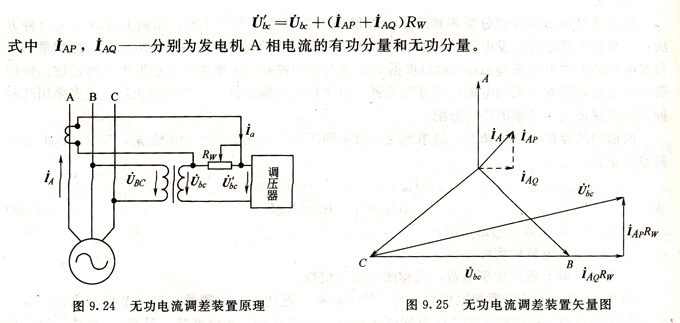 圖9. 24是無功電流調(diào)差裝置的原理圖。它的特點(diǎn)就是在被檢測(cè)的發(fā)電機(jī)線電壓上(如圖中的Ubc),疊加一個(gè)與第三相電流(IA)成正比的壓量,這也是檢測(cè)無功電流的一般方法。其作用原理如下:若忽略測(cè)量回路電流在Rw上的壓降,當(dāng)發(fā)電機(jī)空載時(shí)(IA=0),假定加在測(cè)量元件上的輸入電壓Ubc=Ubc0,而當(dāng)發(fā)電機(jī)具有電流IA時(shí),則測(cè)量元件的輸入電壓為