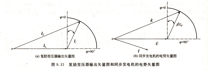 可見,發(fā)電機(jī)的勵(lì)磁電流由兩部分疊加而成:一部分為Iu= K12I1,它基本上是由發(fā)電機(jī)端電壓經(jīng)移相電抗器提供的⊙,叫做勵(lì)磁電流的自勵(lì)分量或電壓分量;一部分為Ii= K32I3,是由發(fā)電機(jī)負(fù)載電流提供的,叫做勵(lì)磁的電流分量或復(fù)勵(lì)分量。由于Iu流過感抗很大的移相電抗器,因此在相位上對發(fā)電機(jī)端電壓約滯后90°,而Ii則和發(fā)電機(jī)負(fù)載電流同相位。注意到這兩點(diǎn),就容易畫出I2的矢量圖,如圖9. 31(a)所示。圖9.31(a)還表明了當(dāng)功率因數(shù)角φ變化時(shí),勵(lì)磁電流I2的變化規(guī)律。